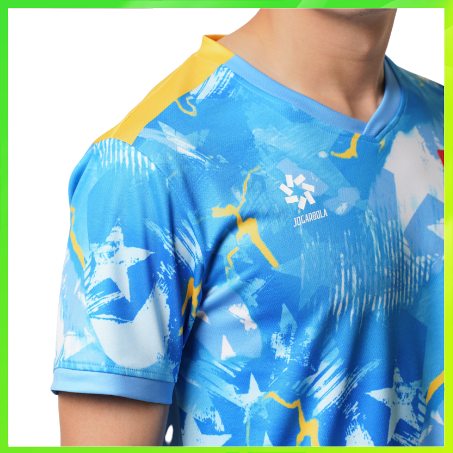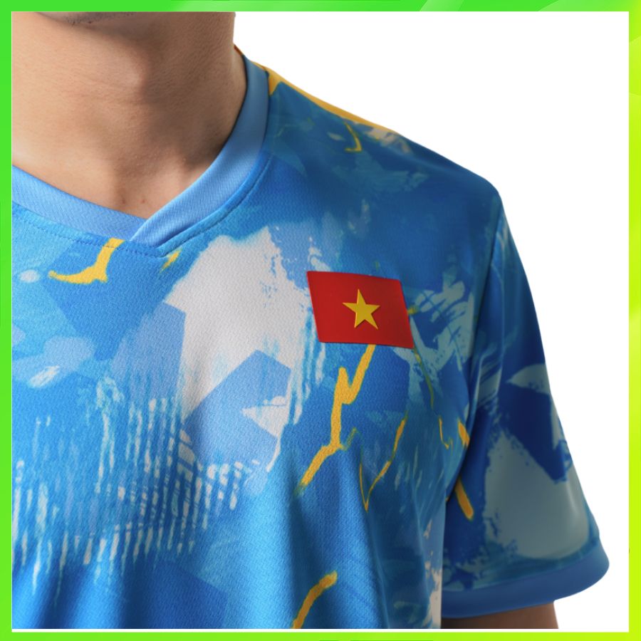 Điểm nhấn đặc biệt là công nghệ dệt hoa văn hai mặt kết hợp hiệu ứng lấp lánh, giúp bề mặt áo thay đổi linh hoạt dưới ánh sáng. Điều này không chỉ tạo nên vẻ ngoài cuốn hút mà còn mang đến cảm giác tràn đầy năng lượng, thể hiện tinh thần chiến đấu mạnh mẽ.